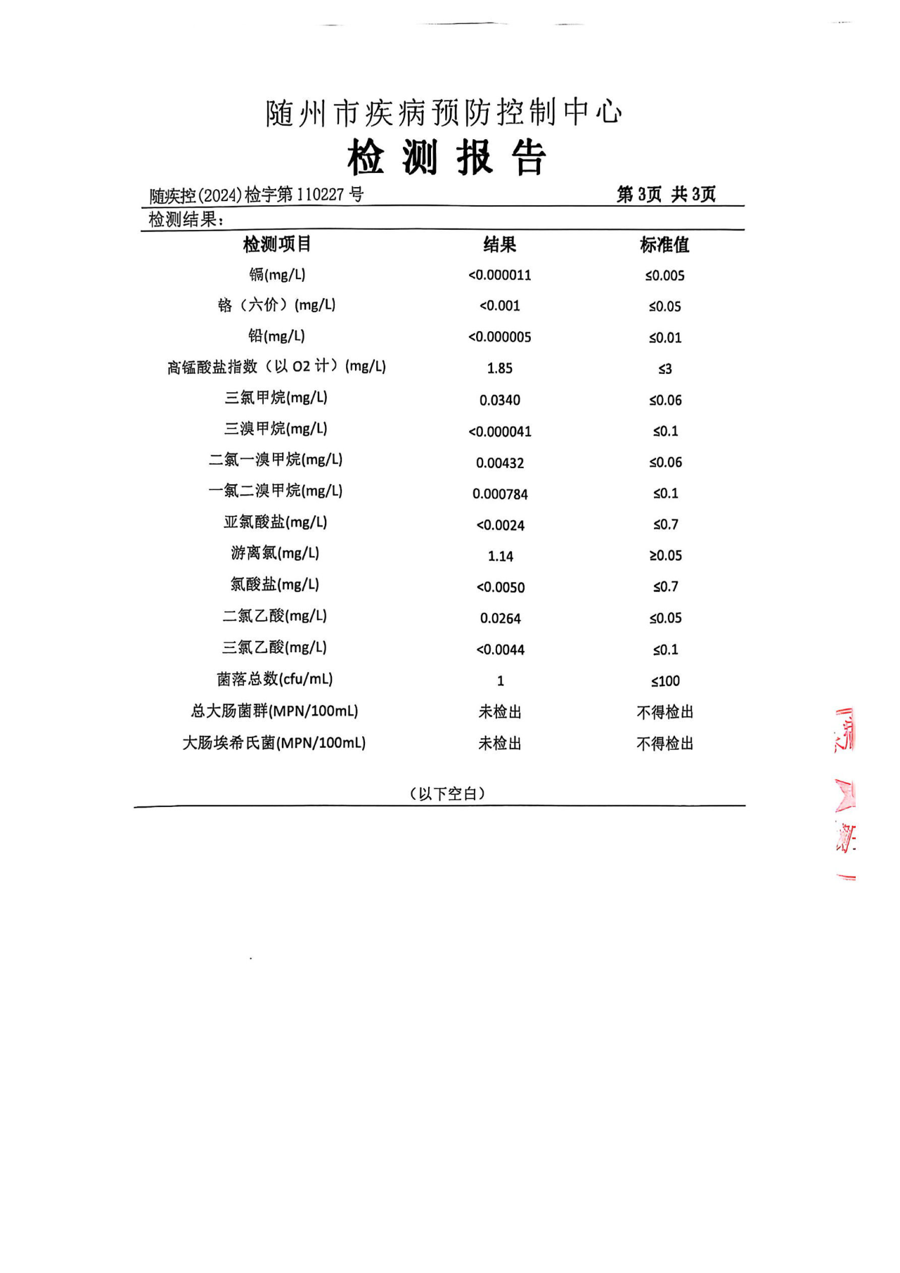 二、我公司在水質(zhì)管理上嚴(yán)格執(zhí)行兩級管理、三級檢測制度,出廠水水質(zhì)均符合國家《生活飲用水衛(wèi)生標(biāo)準(zhǔn)》GB5749-2022的要求,請廣大用戶放心使用。
